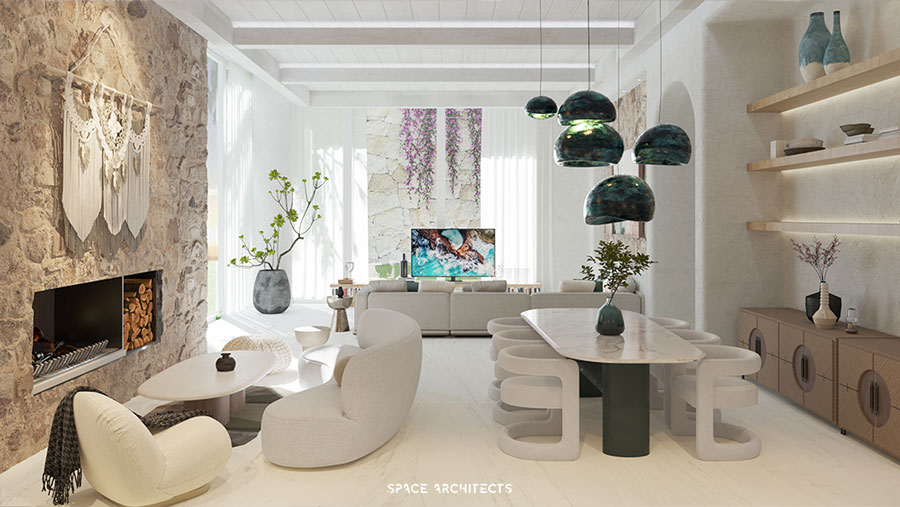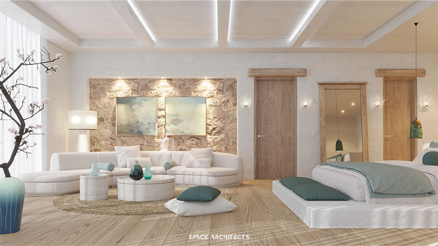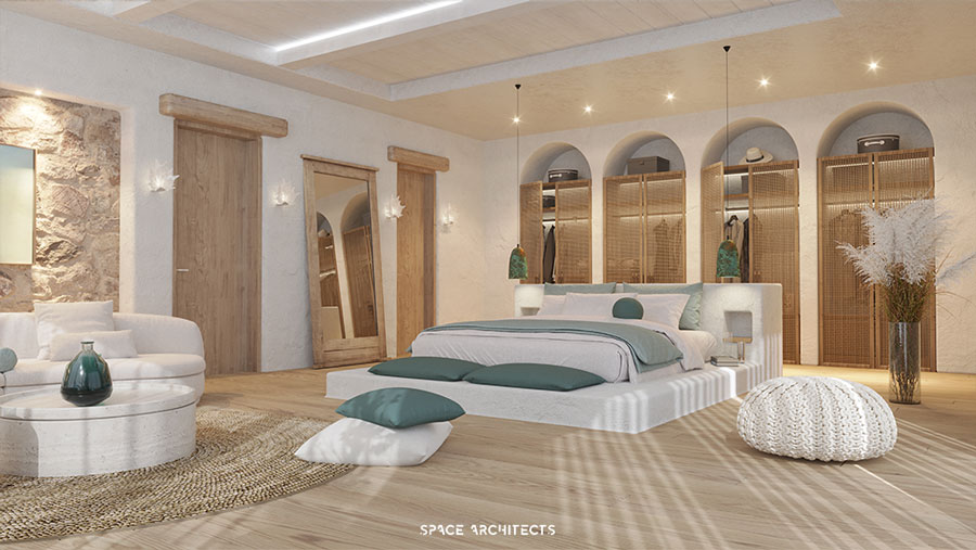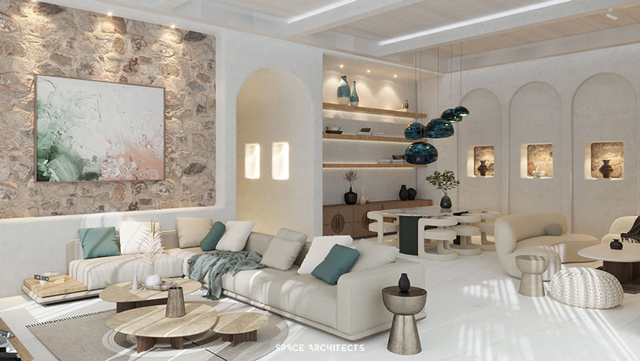 Infusing the charm of Mykonos into the heart of Kuwait! Embrace the Mykonos style, and immerse yourself in a captivating blend of Mykonos colors at our splendid complex of 5 villas. Each villa in Kuwait is a masterpiece of ethnic and Mediterranean styles. Natural materials and earthy colors create an enchanting atmosphere. Welcome to the world of luxury living with a touch of Mykonos magic