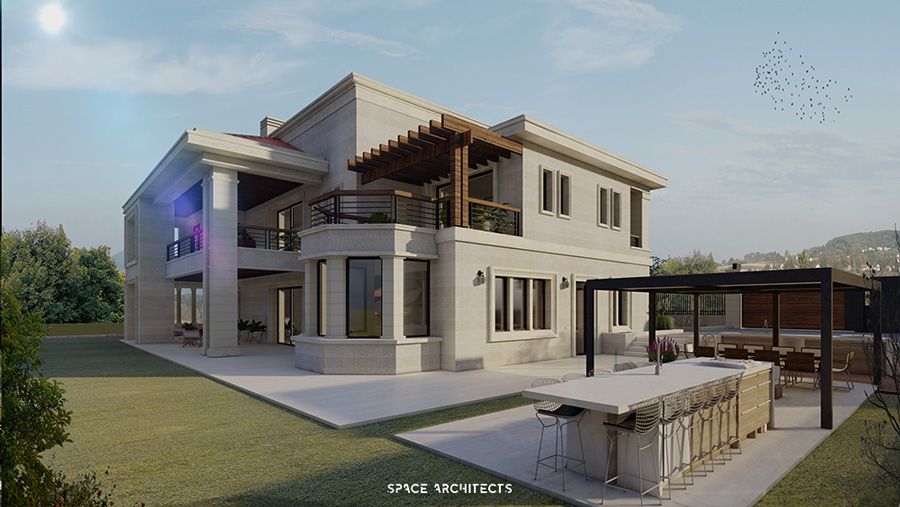 Discover this stunning villa an American-style house infused with oriental charm, nestled atop a hill in Zaarour, Lebanon. Boasting a breathtaking 180-degree view, the design seamlessly blends indoor and outdoor living with spacious terraces on both the ground and first floors. Experience the epitome of modern design and the perfect harmony between architecture and landscape.